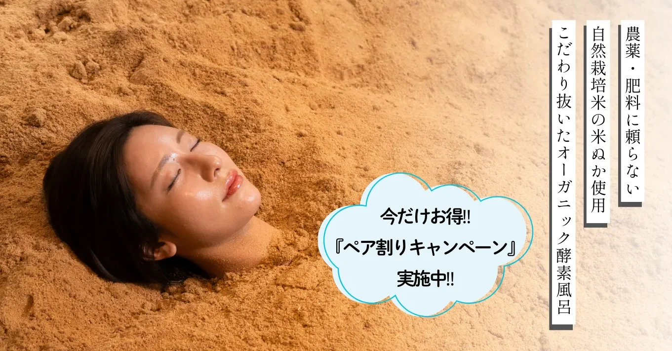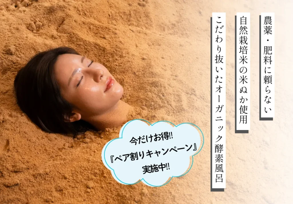 砂風呂のように顔以外の全身を米ぬかに埋まって入浴します。身体の内側から温めることができ、血流やリンパの流れを促します。